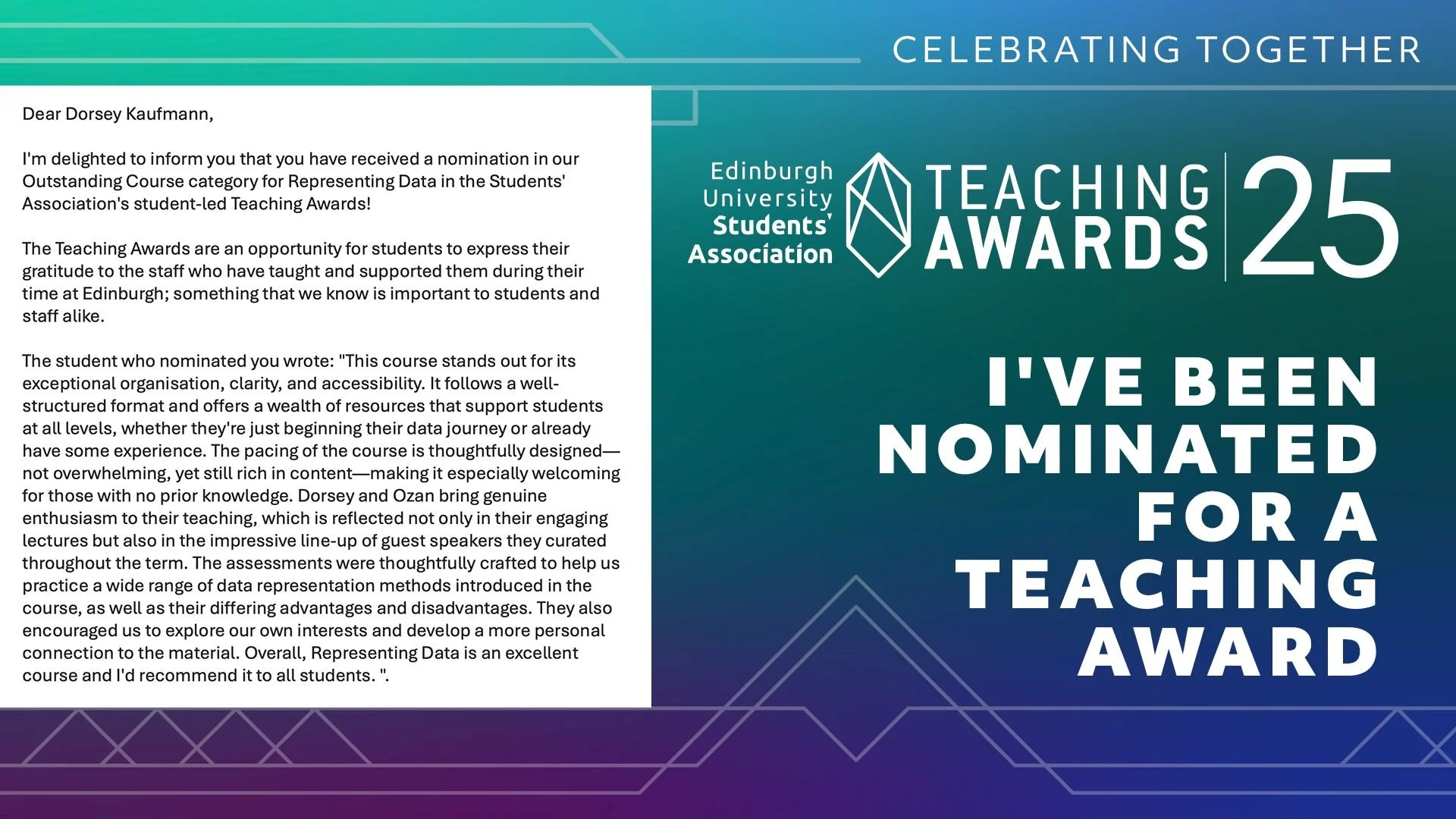 This course introduces students to the theory and practice of representing data. It covers data visualisation theory and practice, while simultaneously inviting students to challenge and extend these concepts beyond visual representations. Students examine a range of different methodologies and practices for representing data in a variety of formats including physical and embodied formats. This course is offered by the Edinburgh Futures Institute (EFI), but open to postgraduate students across the university as well as professionals.